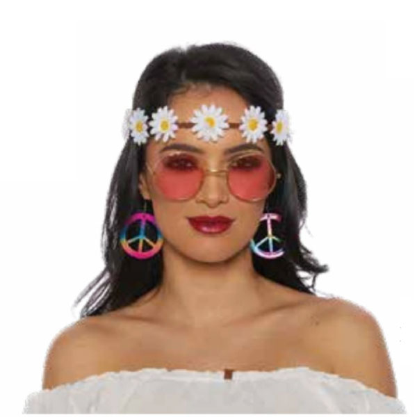 Flower Headband, Round Pink Sunglasses, Peace Sign Earrings