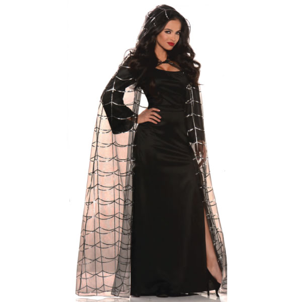 Full Length Tie Front Hooded Cape with Metallic Embossed Spider Design